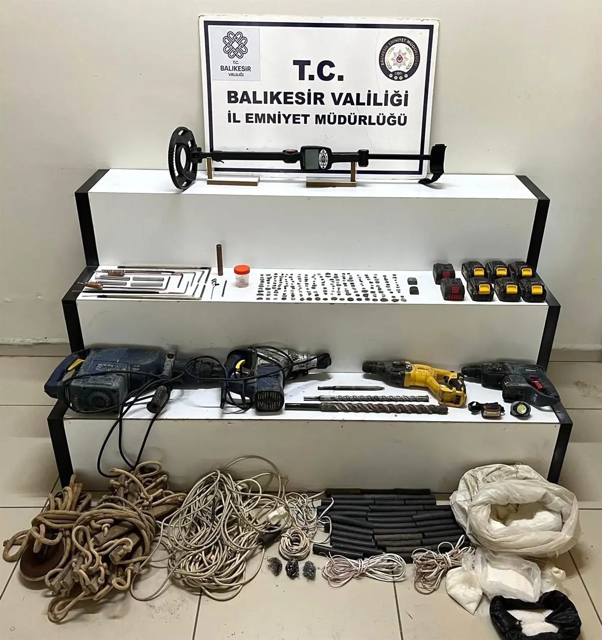 Edinilen bilgiye nazaran, gerçekleştirilen operasyonda farklı devirlere ilişkin 189 adet tarihi sikke ve nesne, 1 adet elektronik el dedektörü, 1 adet manuel dedektör ve aparatları, 4 adet beton delici ve matkap, 8 adet matkap şarjı, 10.5 kilogram sodyum klorid, 6 adet çeşitli uzunluklarda kablo, 35 adet plastik boru, 3 adet kıl tel, 2 adet baş feneri ve seyyar kablo, makaralı halat, seyyar ip merdiven ile 22 gram civa ele geçirildi. Ele geçirilen gereçlerin el üretimi patlayıcı üretiminde kullanılabileceği değerlendirildi.