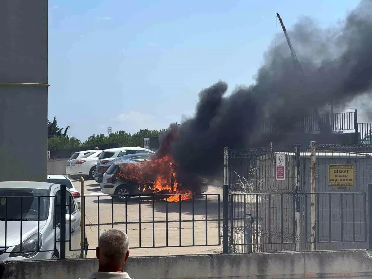 Balıkesir’in Bandırma ilçesinde hastane otoparkında park halinde bulunan araba alev aldı. İtfaiye takımlarının müdahalesiyle söndürülen yangında araç kullanılamaz hale geldi.