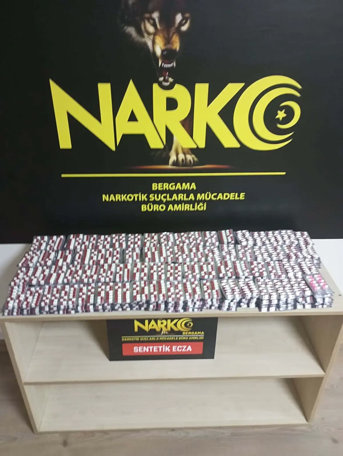 İZMİR’in Bergama ilçesinde polis tarafından bir konuta yapılan operasyonda 5 bin 990 sentetik ecza hap ele geçirildi, gözaltına alınan 2 kuşkulu tutuklandı.