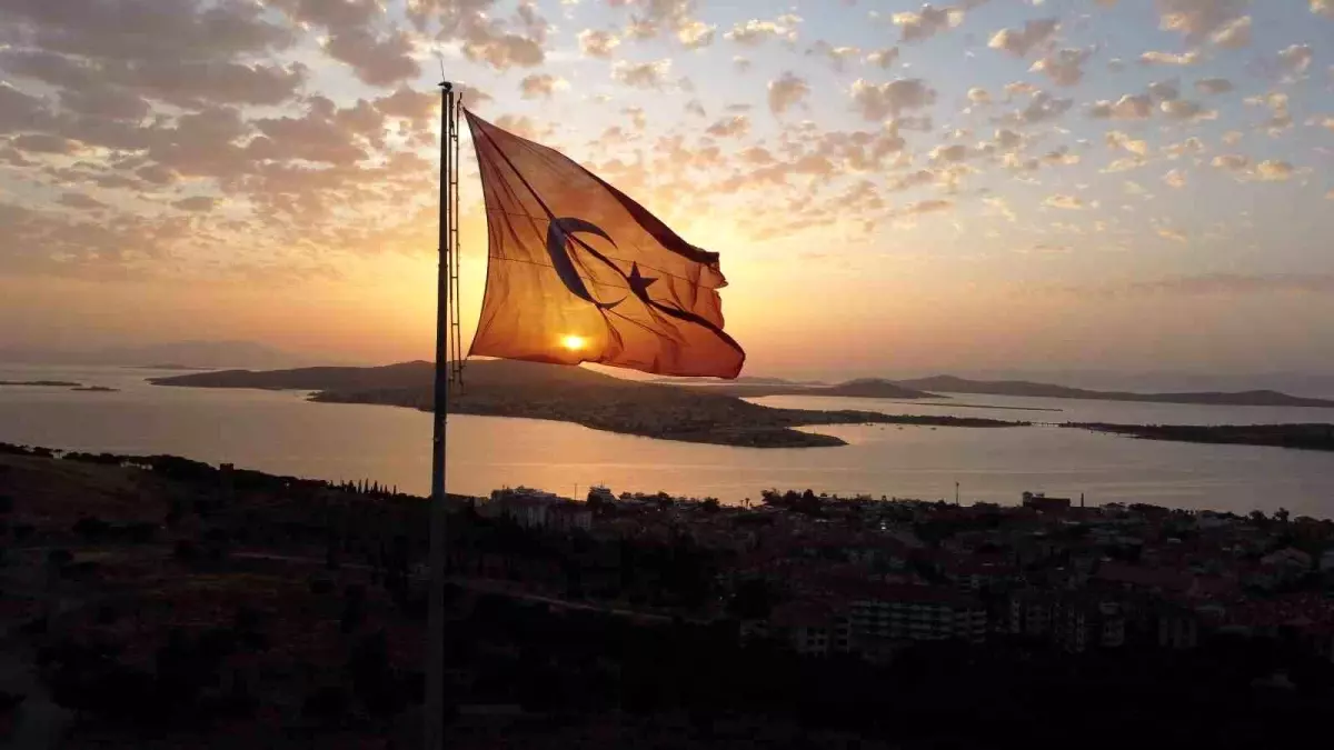 Balıkesir’in Ayvalık ilçesinde Cennet Zirvesi’nde bulunan dev Türk bayrağı, gün batımında Ayvalık Adaları görünümüyle kartpostallık imajlar oluşturdu.