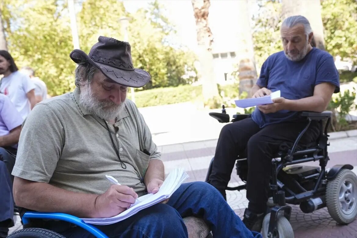 Yaklaşık 20 kişilik engelli küme, Kültürpark Fuar Alanı’ndaki Büyükşehir Belediyesi hizmet binası önünde bir ortaya geldi.