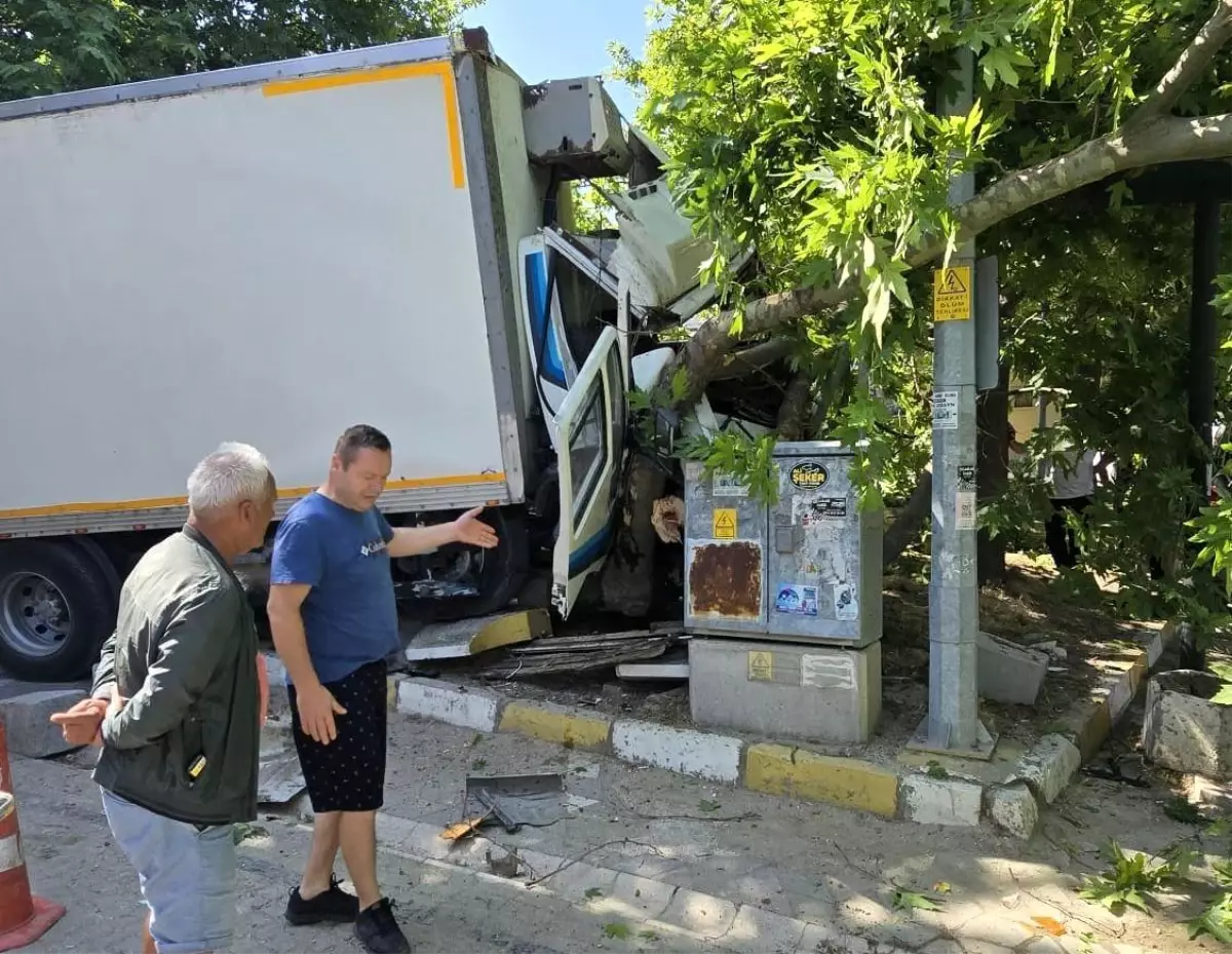 Balıkesir’in Erdek ilçesine bağlı Ocaklar Mahallesi’nde meydana gelen kazada, frenleri patlayan kamyon ağaca çarparak durabildi.
