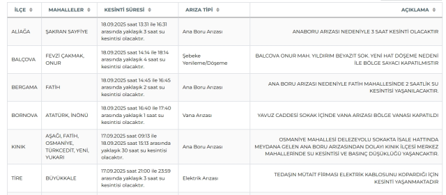 İzmir su kesintisi olan yerler yayınlandı. İzmir Su ve Kanalizasyon Yönetimi (İZSU) 18 Eylül günü İzmir’de su kesintisi yaşanacak ilçeleri duyurdu. Pekala, Sular ne vakit, saat kaçta gelecek? İşte İZSU 18 Eylül İzmir su kesintisi saatleri!