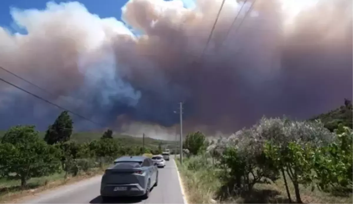 İZMİR’DEKİ YANGIN, RÜZGARIN TESİRİYLE ORMANLIK ALANA SIÇRADI.