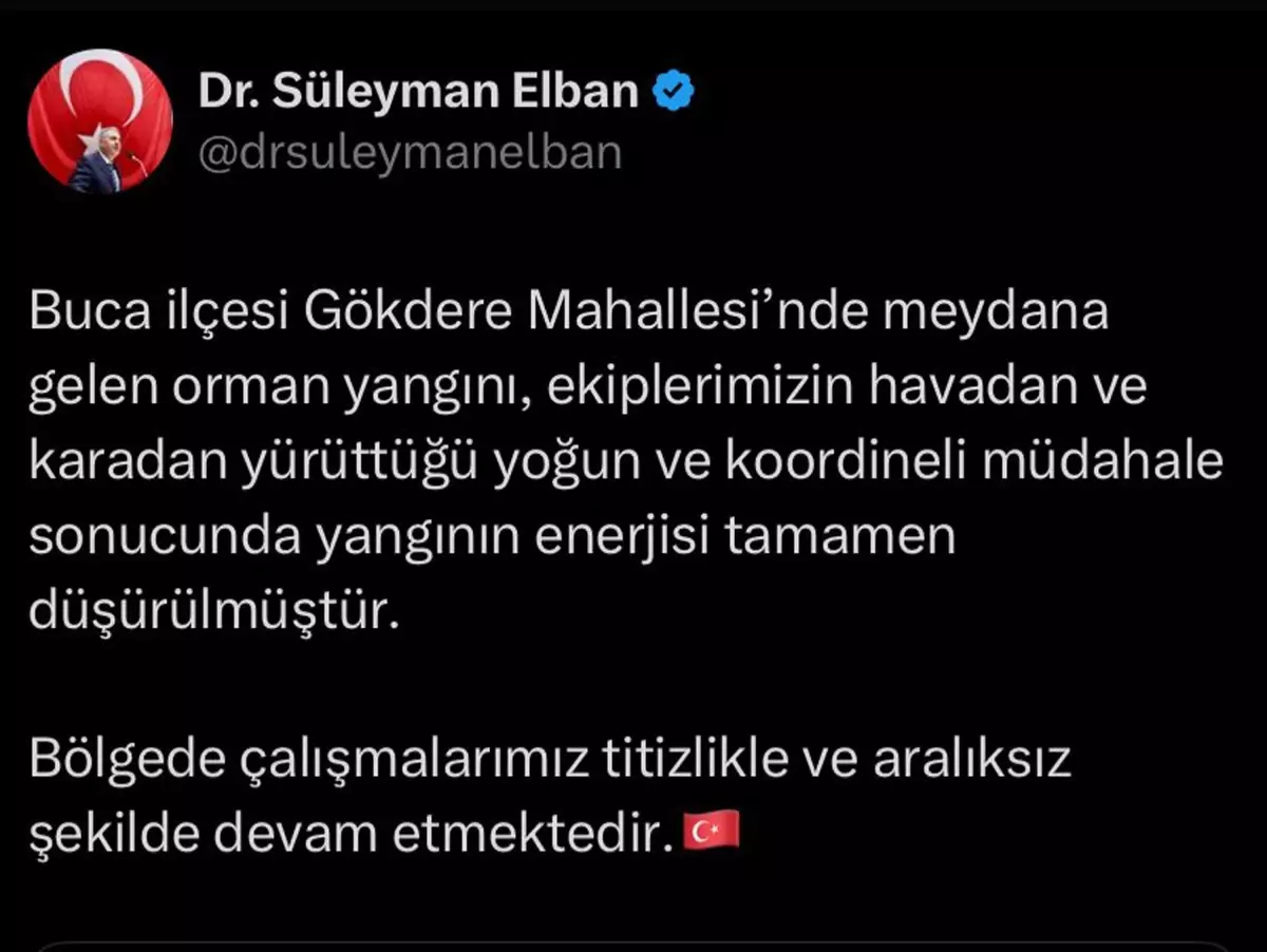 İzmir Valisi Süleyman Elban, yangınla ilgili toplumsal medya hesabından açıklama yaptı. Vali Elban paylaşımında, “Buca ilçesi Gökdere Mahallesinde çıkan orman yangınının, gruplarımızın havadan ve karadan yürüttüğü ağır ve koordineli müdahalesi sonucunda gücü büsbütün düşürülmüştür. Bölgede çalışmalarımız titizlikle ve aralıksız formda devam etmektedir” sözlerine yer verdi.
